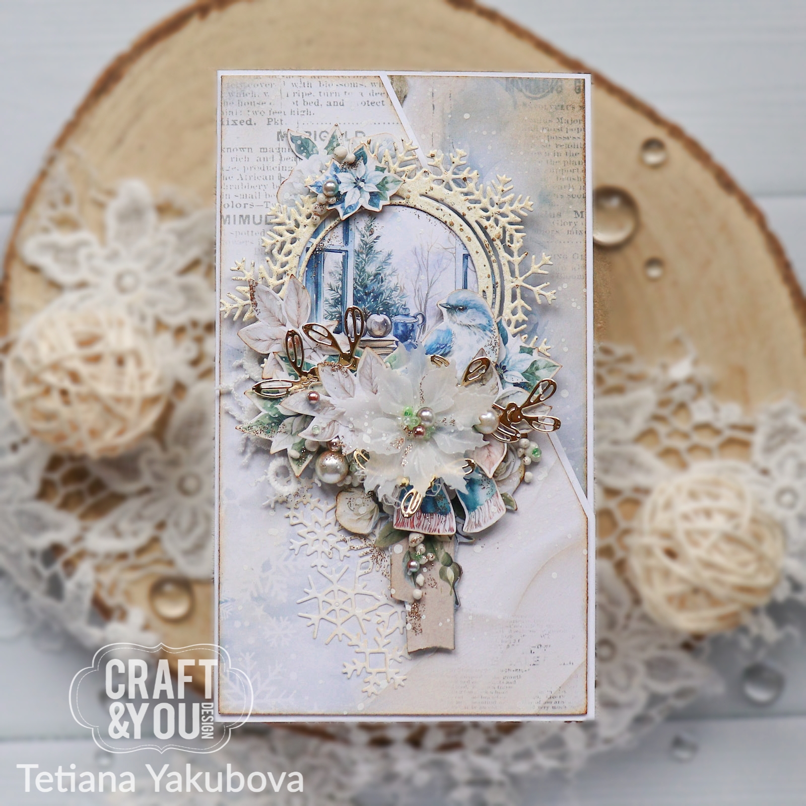Another winter card was made by Tetiana Yakubova. She used "Paint over the winter" collection and our dies, including two newest ones - mistletoe and snowflake background.